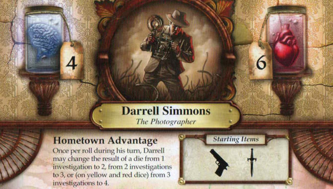 Investigators are the player controlled characters and have two independent “hitpoints”, health and sanity. If either of these reach 0 the character dies and is replaced with a new one - in order for this to have consequences, dieing also triggers a penalty in the form of a Doom Token. Investigators can accumulate items of various kinds throughout the game by completing Adventures, the majority of which are consumables that provide single-use benefits when attempting Adventures. Like Ancient Ones, there’s a large selection of Investigators with differing amounts of health/sanity hitpoints, special abilities and starting items.